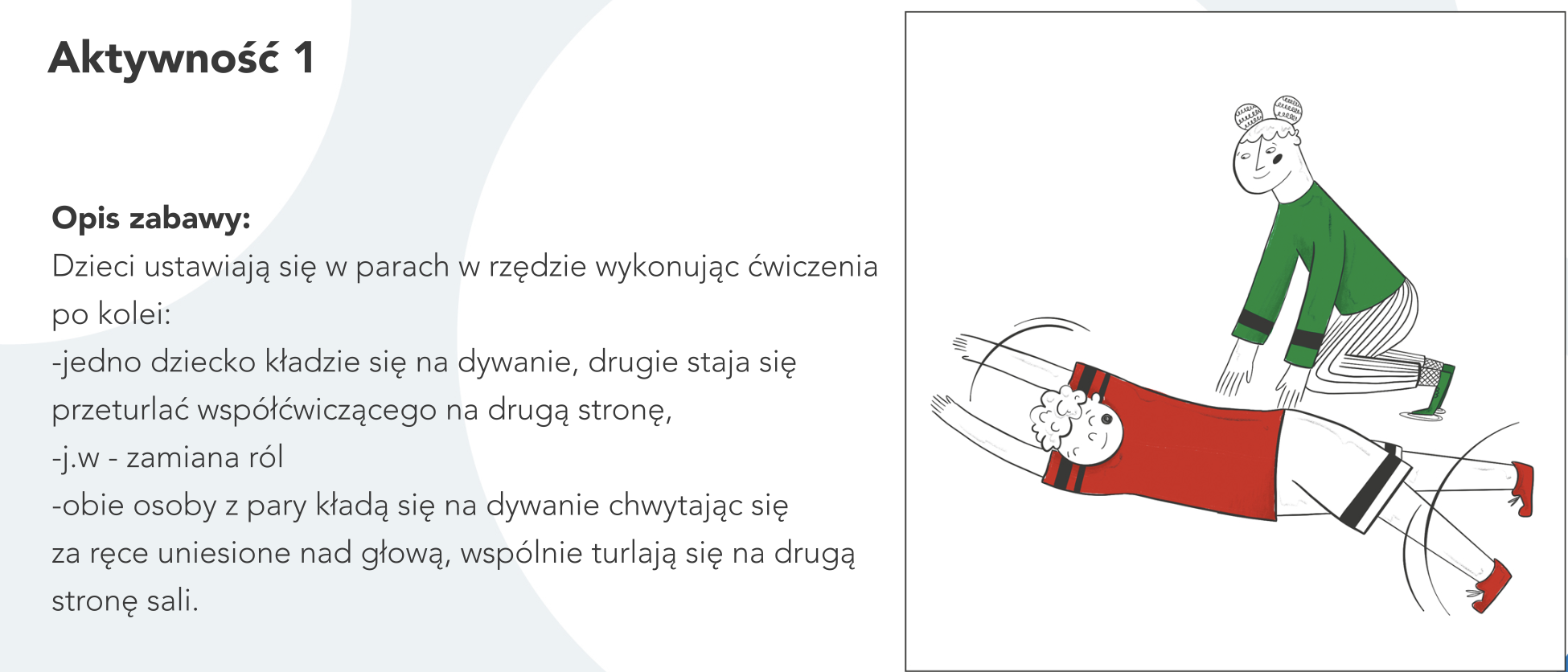 - obie osoby z pary kładą się na dywanie chwytając się za ręce uniesione nad głową, wspólnie turlają się na drugą stronę sali