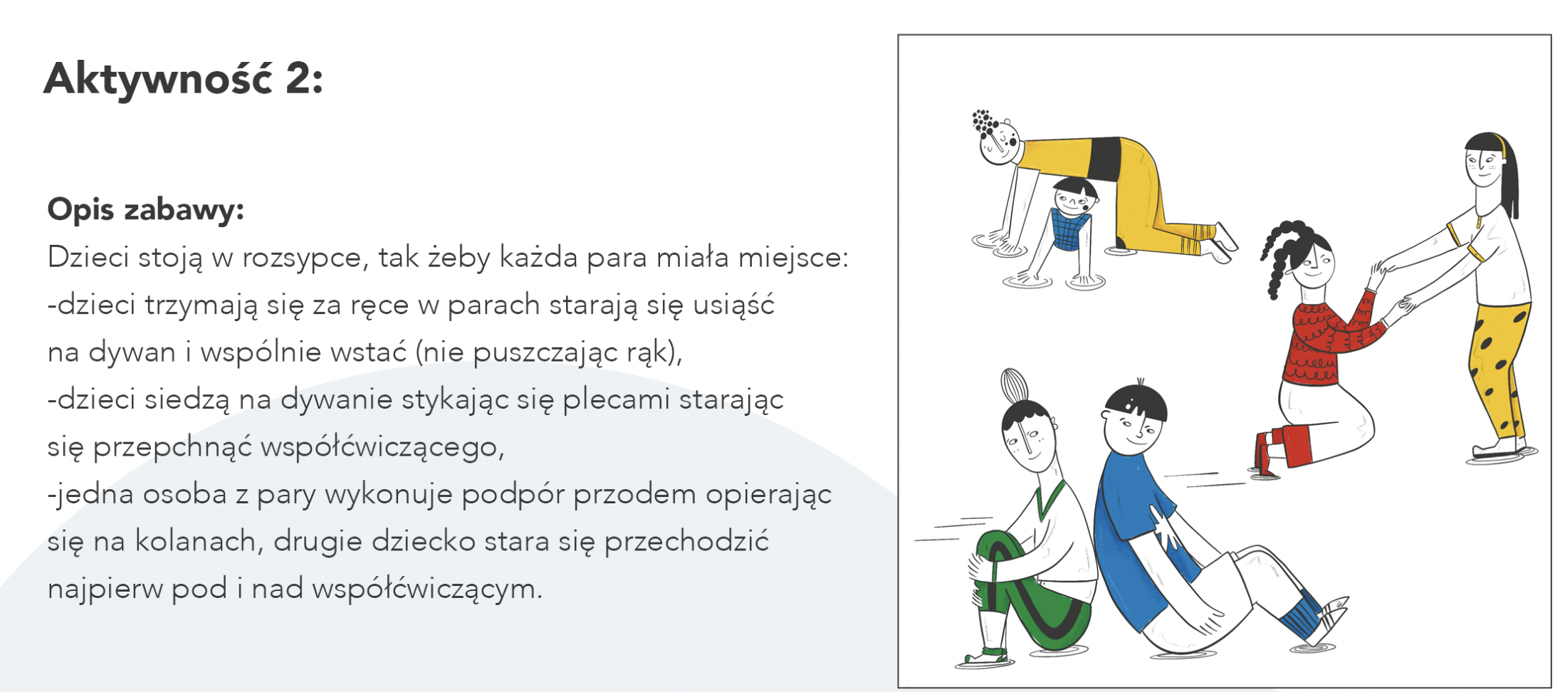 - dzieci trzymają się za ręce w parach starają się usiąść na dywan i wspólnie wstać (nie puszczając rąk),