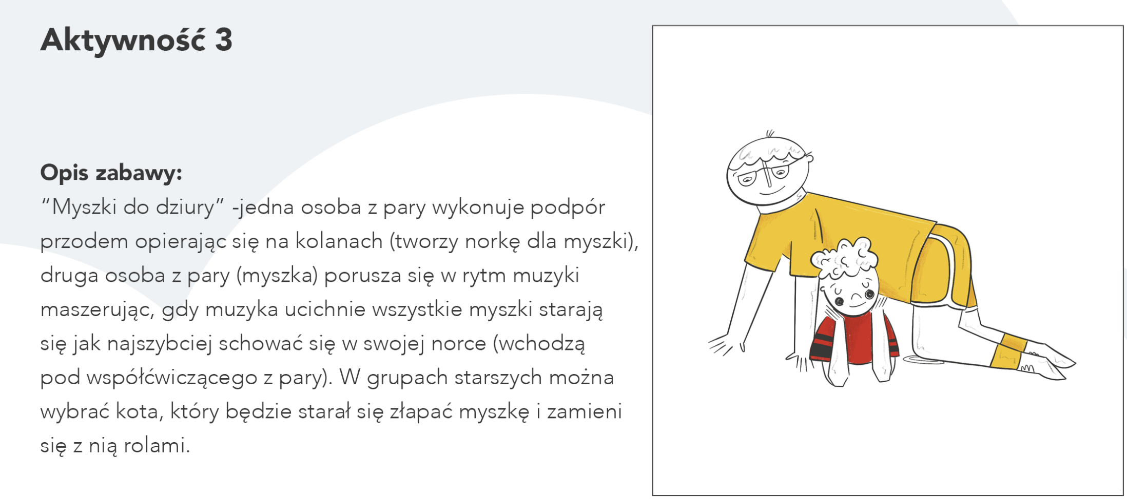 “Myszki do dziury” -jedna osoba z pary wykonuje podpór przodem opierając się na kolanach (tworzy norkę dla myszki), druga osoba z pary (myszka) porusza się w rytm muzyki maszerując, gdy muzyka ucichnie wszystkie myszki starają się jak najszybciej schować się w swojej norce (wchodzą pod współćwiczącego z pary). W grupach starszych można wybrać kota, który będzie starał się złapać myszkę i zamieni się z nią rolami.
