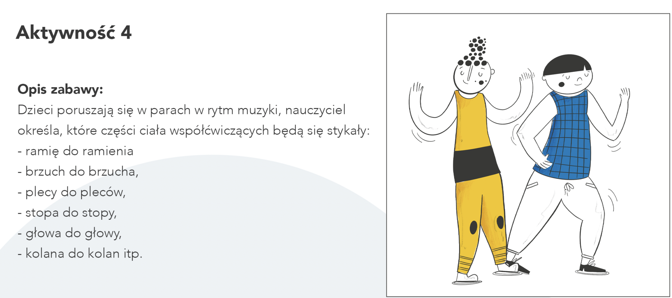 Dzieci poruszają się w parach w rytm muzyki, nauczyciel określa, które części ciała współćwiczących będą się stykały: