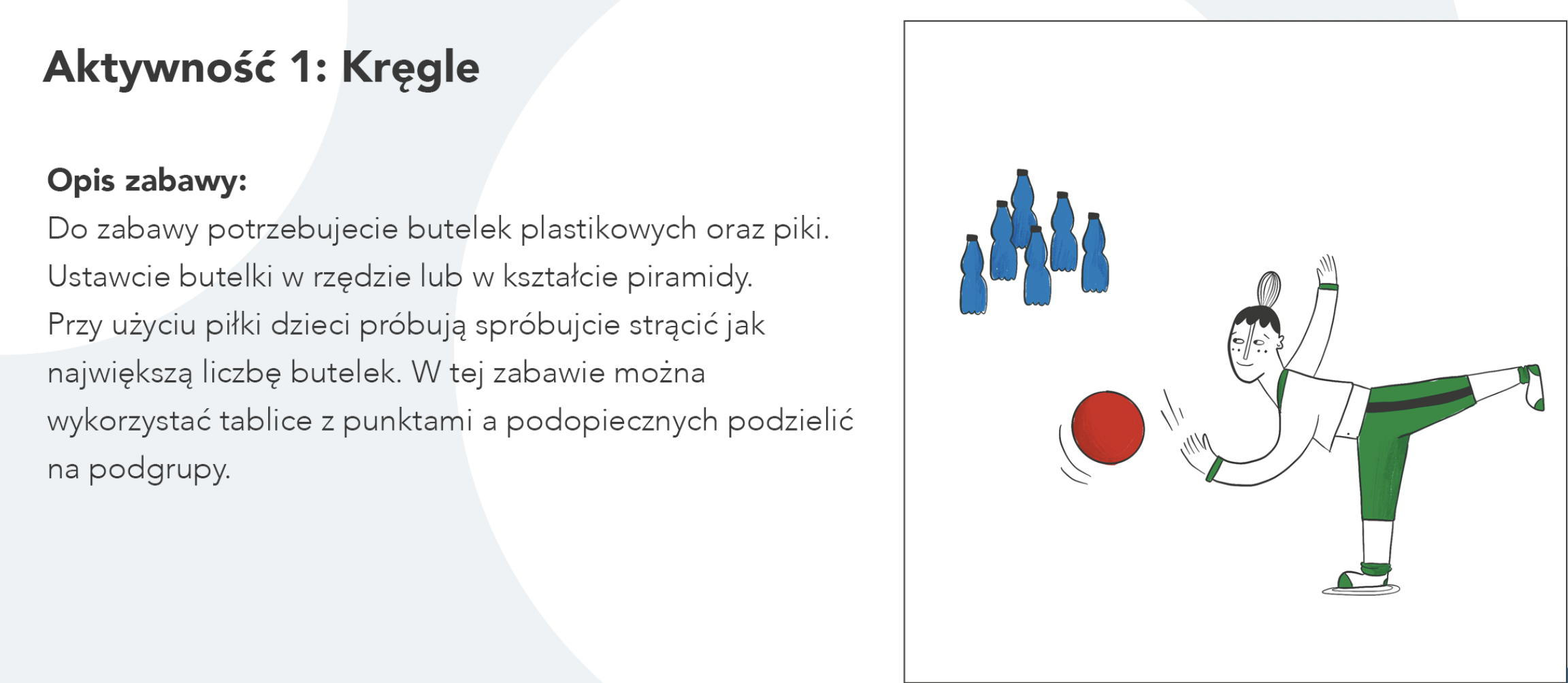 Ustawcie butelki w rzędzie lub w kształcie piramidy. Przy użyciu piłki dzieci próbują spróbujcie strącić jak największą liczbę butelek. W tej zabawie można wykorzystać tablice z punktami a podopiecznych podzielić na podgrupy