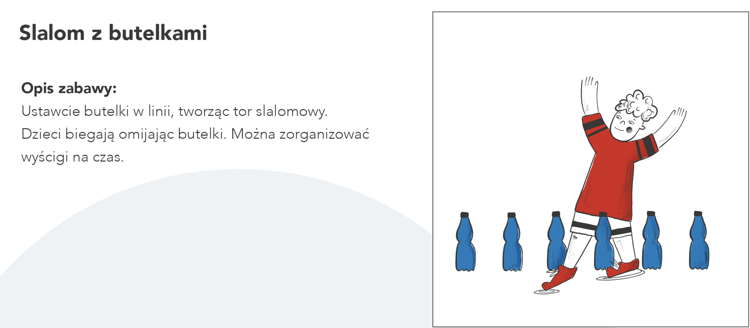 Ustawcie butelki w linii, tworząc tor slalomowy. Dzieci biegają omijając butelki. Można zorganizować wyścigi na czas.