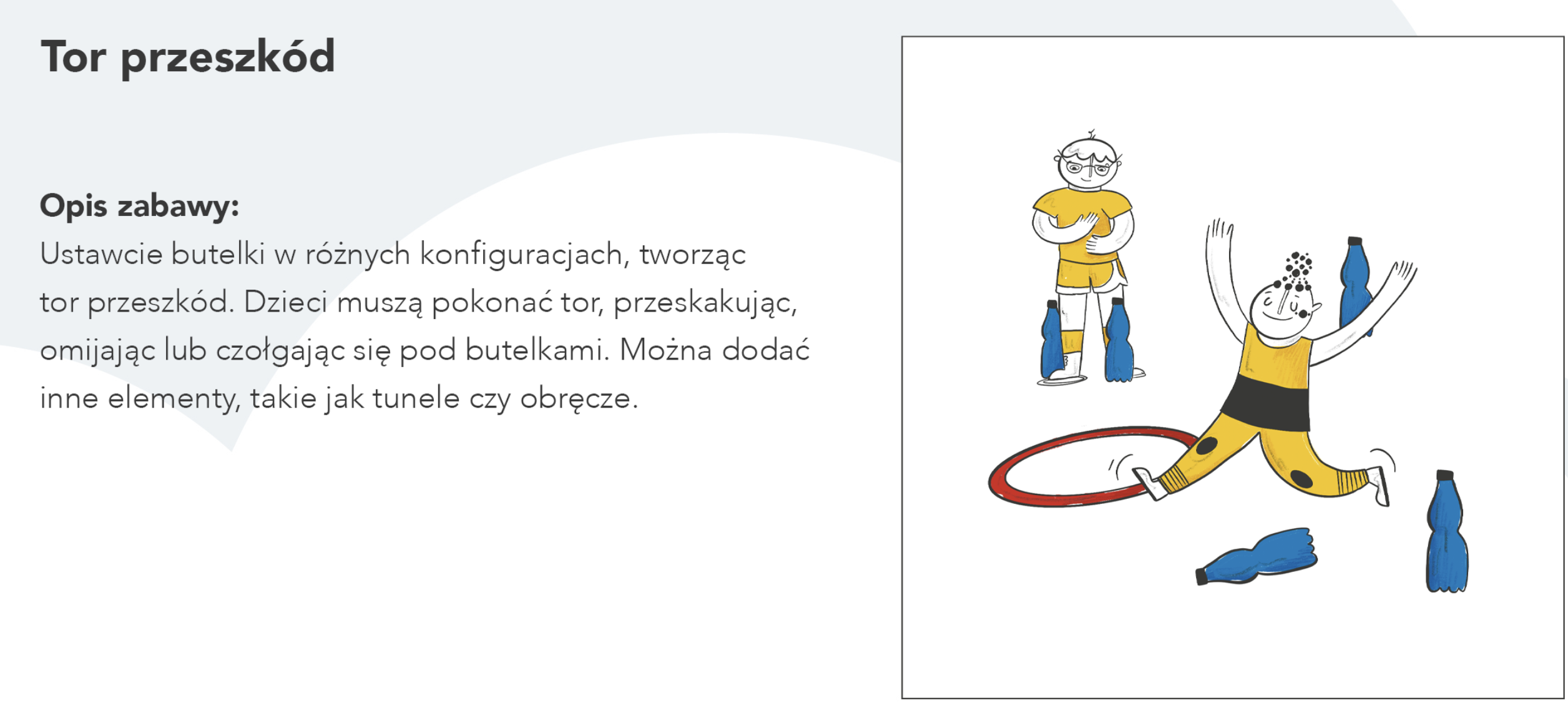 Ustawcie butelki w różnych konfiguracjach, tworząc tor przeszkód. Dzieci muszą pokonać tor, przeskakując, omijając lub czołgając się pod butelkami. Można dodać inne elementy, takie jak tunele czy obręcze.