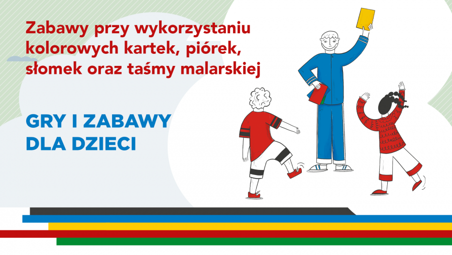 Zabawy przy wykorzystaniu kolorowych kartek, piórek, słomek oraz taśm malarskich