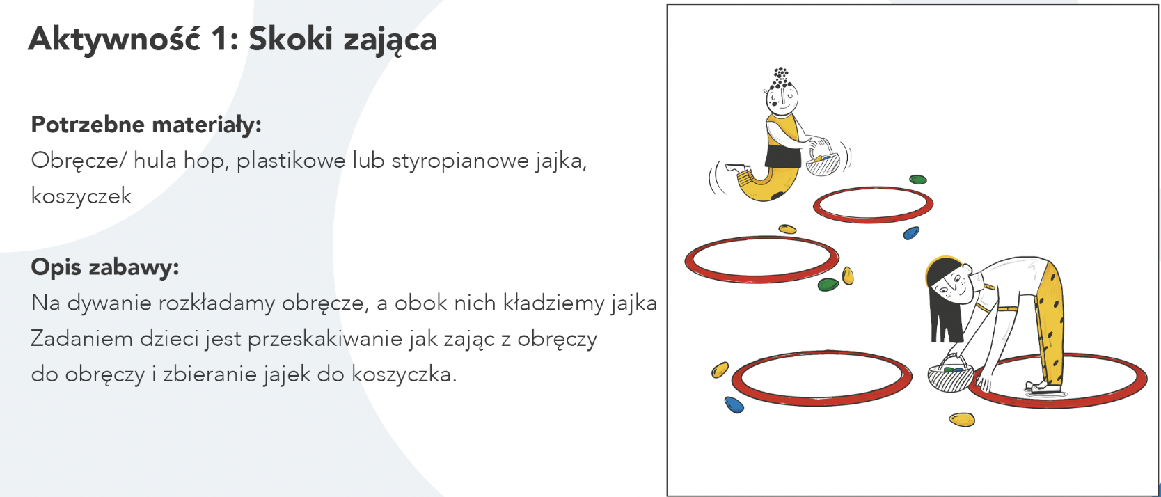 Na dywanie rozkładamy obręcze, a obok nich kładziemy jajka. Zadaniem dzieci jest przeskakiwanie jak zając z obręczy do obręczy i zbieranie jajek do koszyczka.
