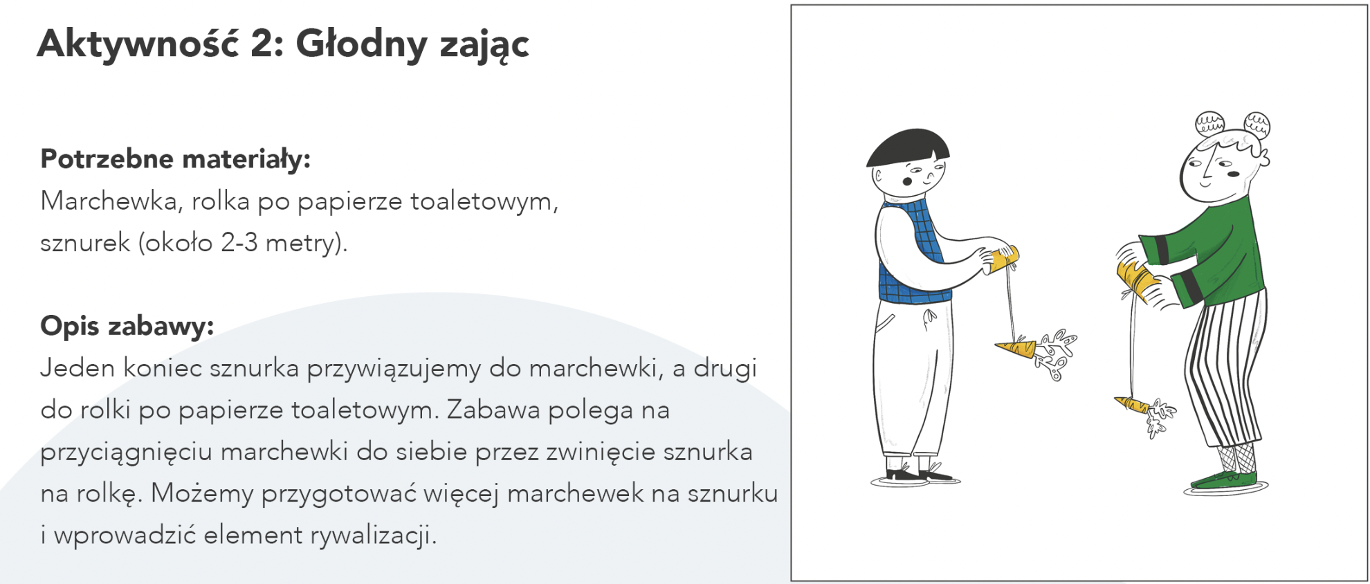 Jeden koniec sznurka przywiązujemy do marchewki, a drugi do rolki po papierze toaletowym. Zabawa polega na przyciągnięciu marchewki do siebie przez zwinięcie sznurka na rolkę. Możemy przygotować więcej marchewek na sznurku i wprowadzić element rywalizacji.