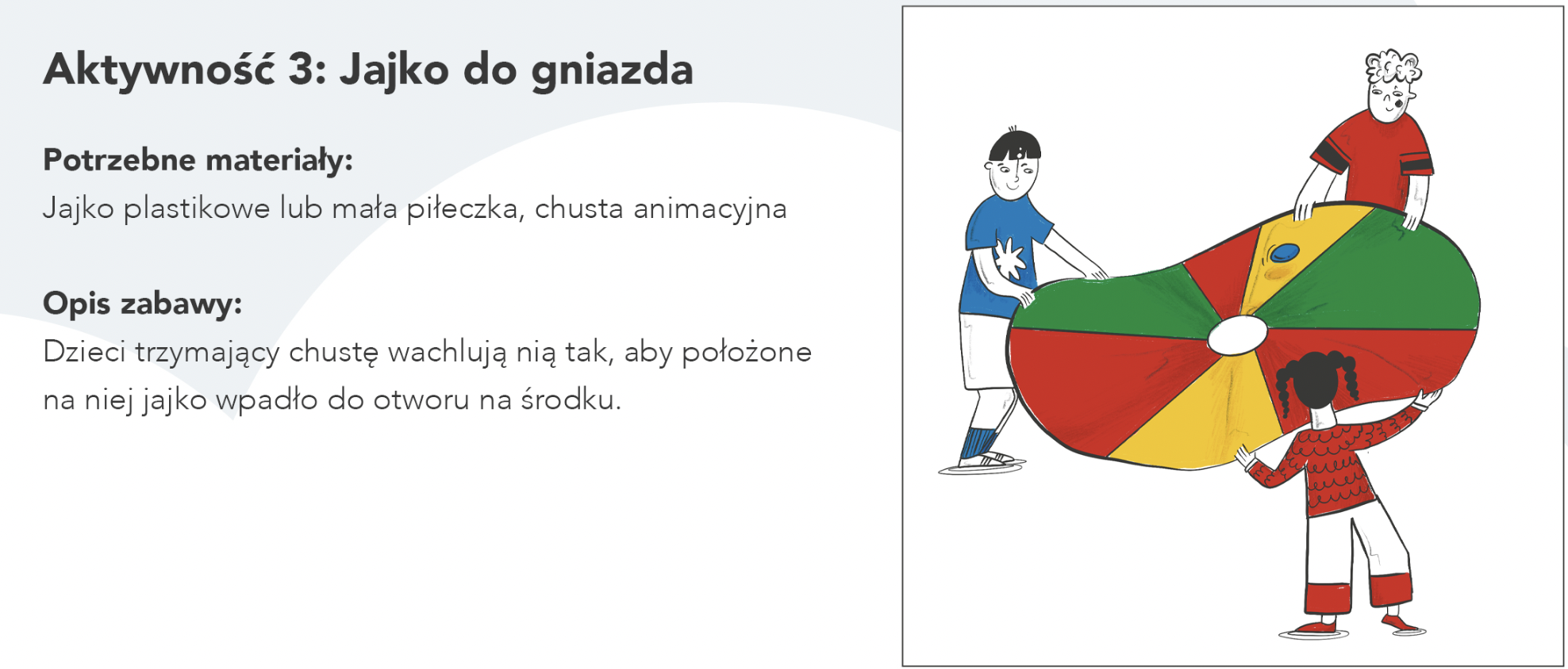 Dzieci trzymający chustę wachlują nią tak, aby położone na niej jajko wpadło do otworu na środku.