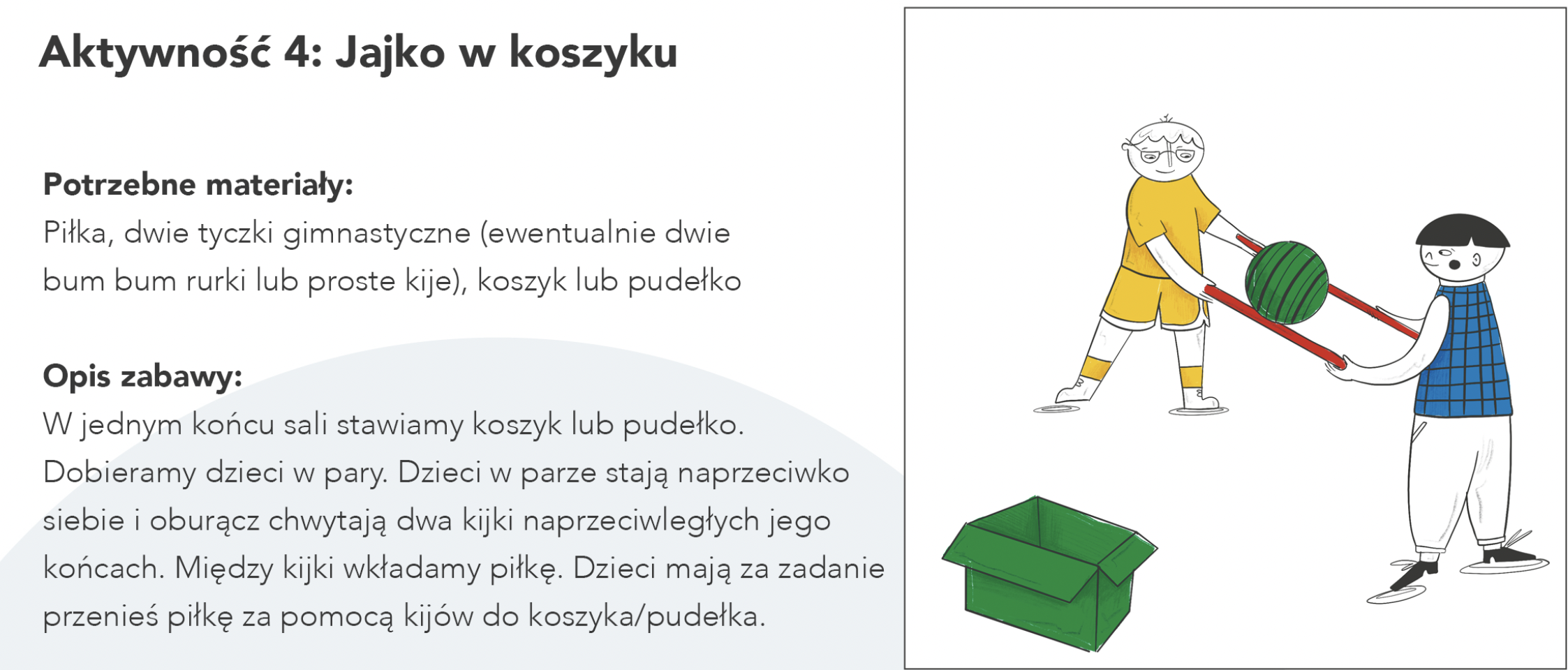 W jednym końcu sali stawiamy koszyk lub pudełko. Dobieramy dzieci w pary. Dzieci w parze stają naprzeciwko siebie i oburącz chwytają dwa kijki naprzeciwległych jego końcach. Między kijki wkładamy piłkę. Dzieci mają za zadanie przenieś piłkę za pomocą kijów do koszyka/pudełka.
