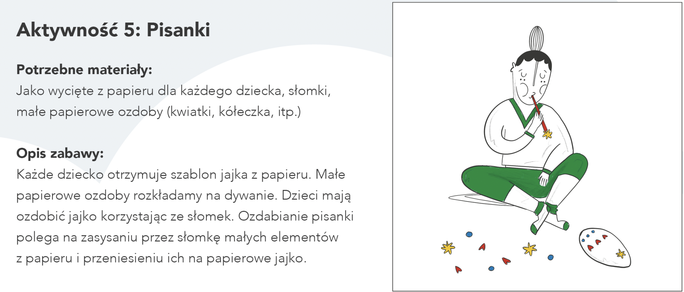 Każde dziecko otrzymuje szablon jajka z papieru. Małe papierowe ozdoby rozkładamy na dywanie. Dzieci mają ozdobić jajko korzystając ze słomek. Ozdabianie pisanki polega na zasysaniu przez słomkę małych elementów z papieru i przeniesieniu ich na papierowe jajko.