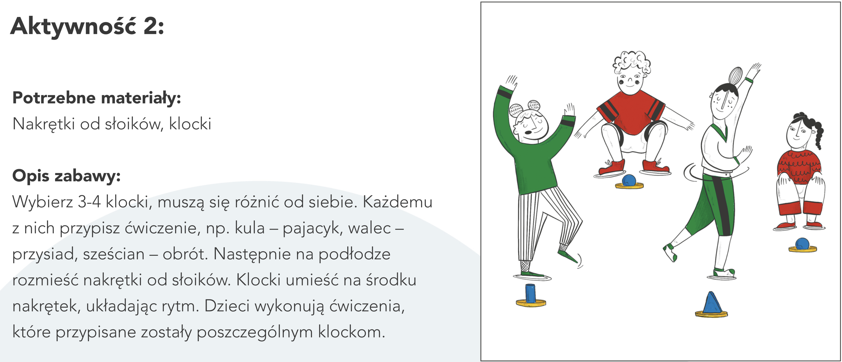 Wybierz 3-4 klocki, muszą się różnić od siebie. Każdemu z nich przypisz ćwiczenie, np. kula – pajacyk, walec – przysiad, sześcian – obrót. Następnie na podłodze rozmieść nakrętki od słoików. Klocki umieść na środku nakrętek, układając rytm. Dzieci wykonują ćwiczenia, które przypisane zostały poszczególnym klockom.