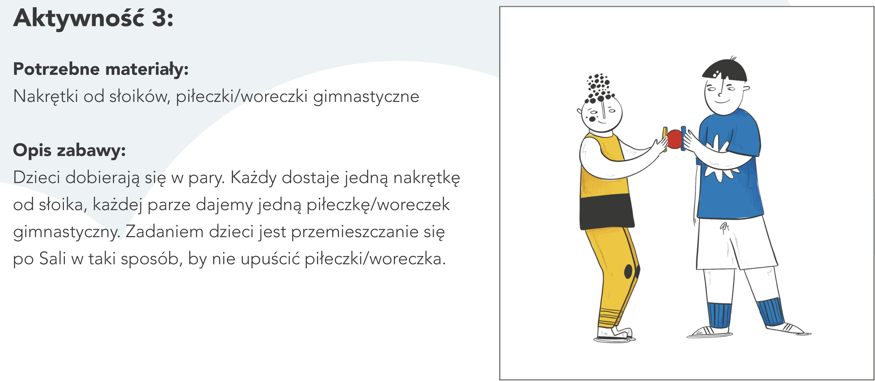 Dzieci dobierają się w pary. Każdy dostaje jedną nakrętkę od słoika, każdej parze dajemy jedną piłeczkę/woreczek gimnastyczny. Zadaniem dzieci jest przemieszczanie się po Sali w taki sposób, by nie upuścić piłeczki/woreczka.
