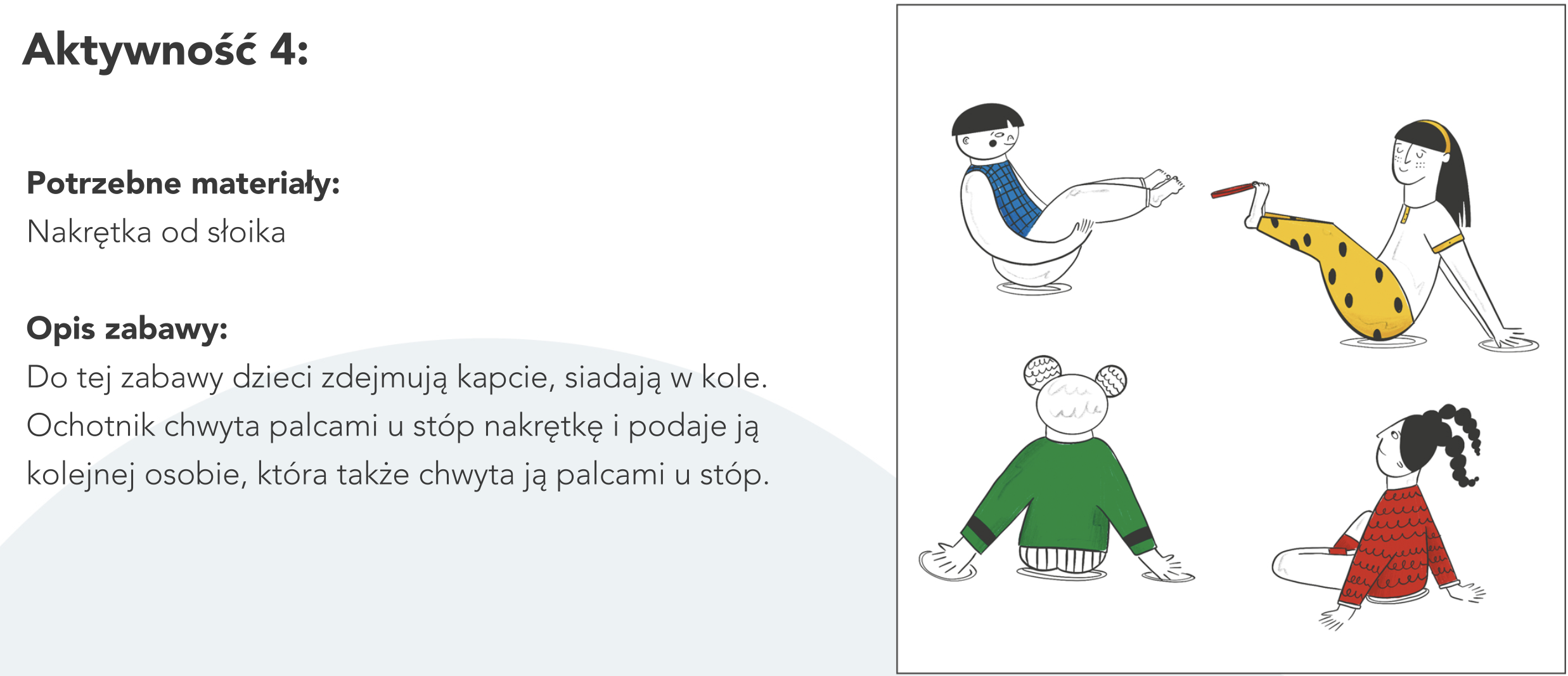 Do tej zabawy dzieci zdejmują kapcie, siadają w kole. Ochotnik chwyta palcami u stóp nakrętkę i podaje ją kolejnej osobie, która także chwyta ją palcami u stóp.