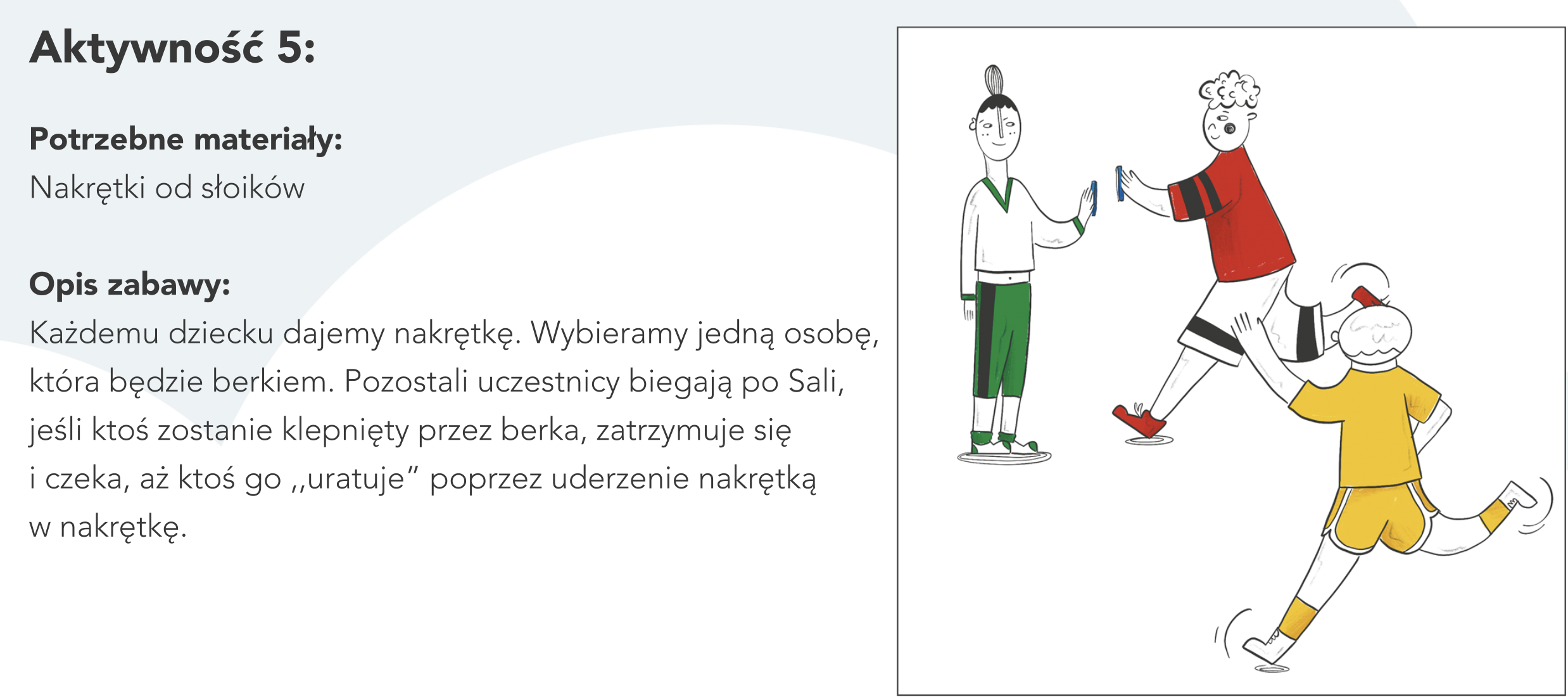 Każdemu dziecku dajemy nakrętkę. Wybieramy jedną osobę, która będzie berkiem. Pozostali uczestnicy biegają po Sali, jeśli ktoś zostanie klepnięty przez berka, zatrzymuje się i czeka, aż ktoś go ,,uratuje” poprzez uderzenie nakrętką w nakrętkę.
